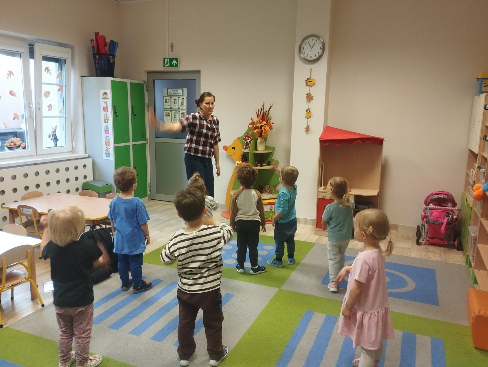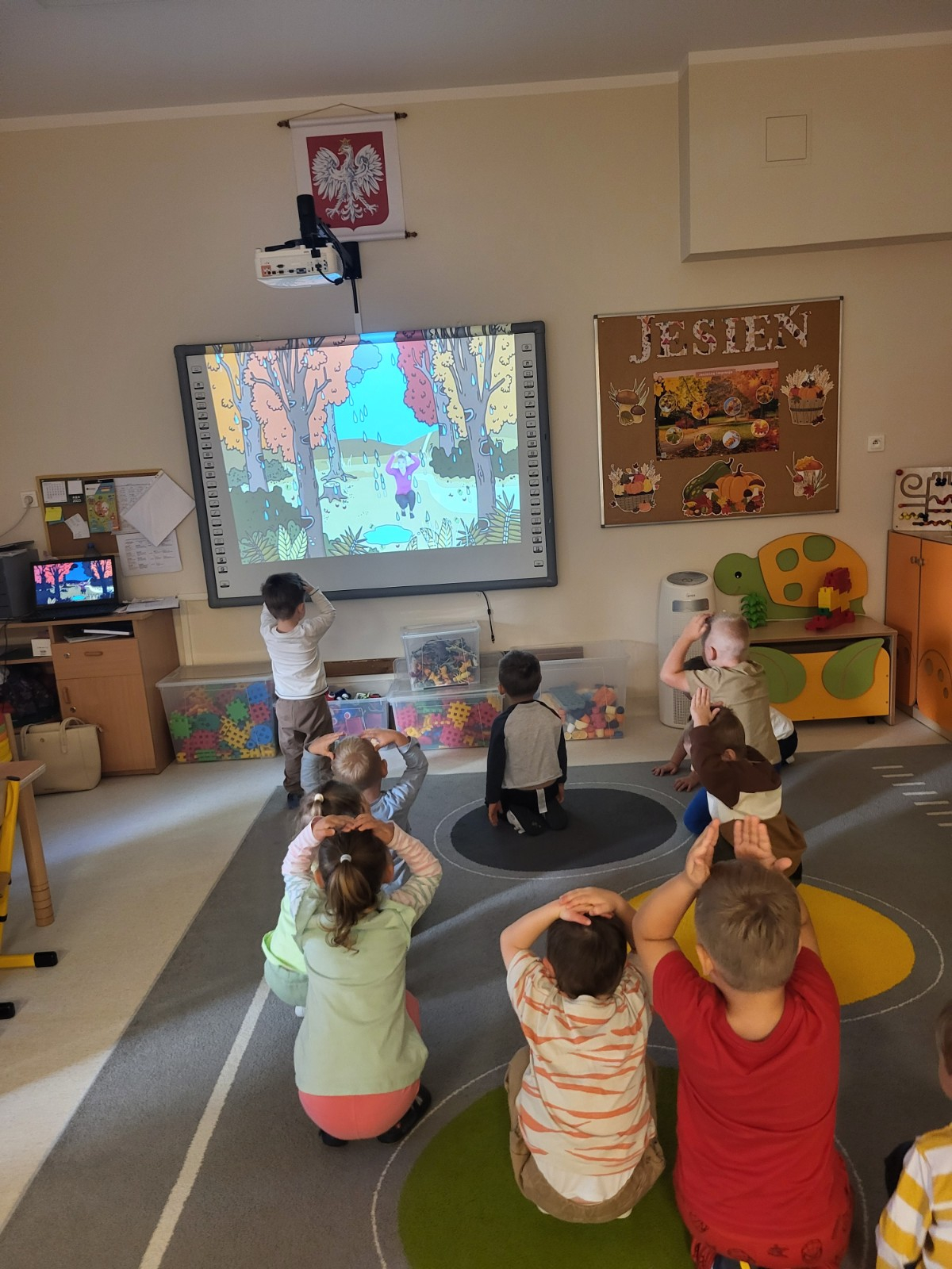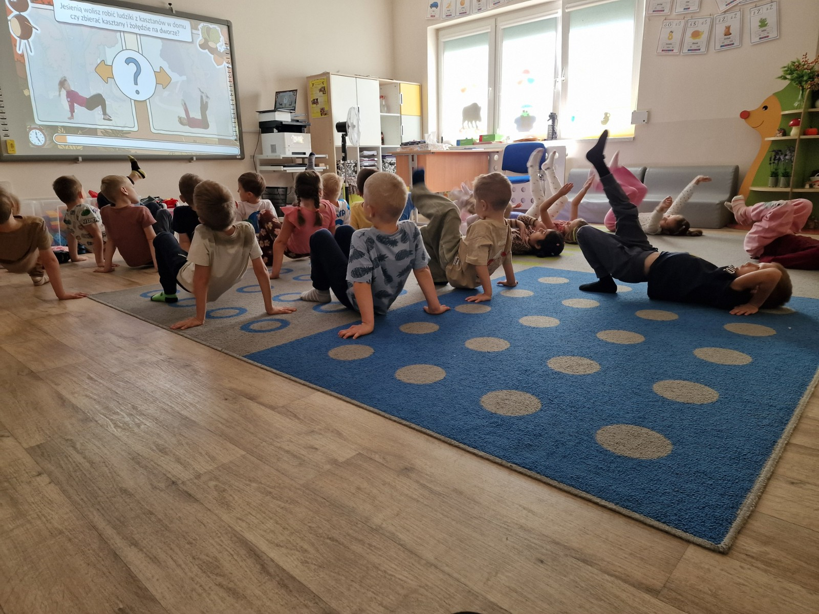 Ponad to przedszkolaki uczestniczyły w aktywnościach z języka angielskiego w trakcie, których dzieci rozpoznawały angielskie słówka związane z jesienią i wybierały odpowiednie obrazki, pokazując odpowiedzi ruchem.