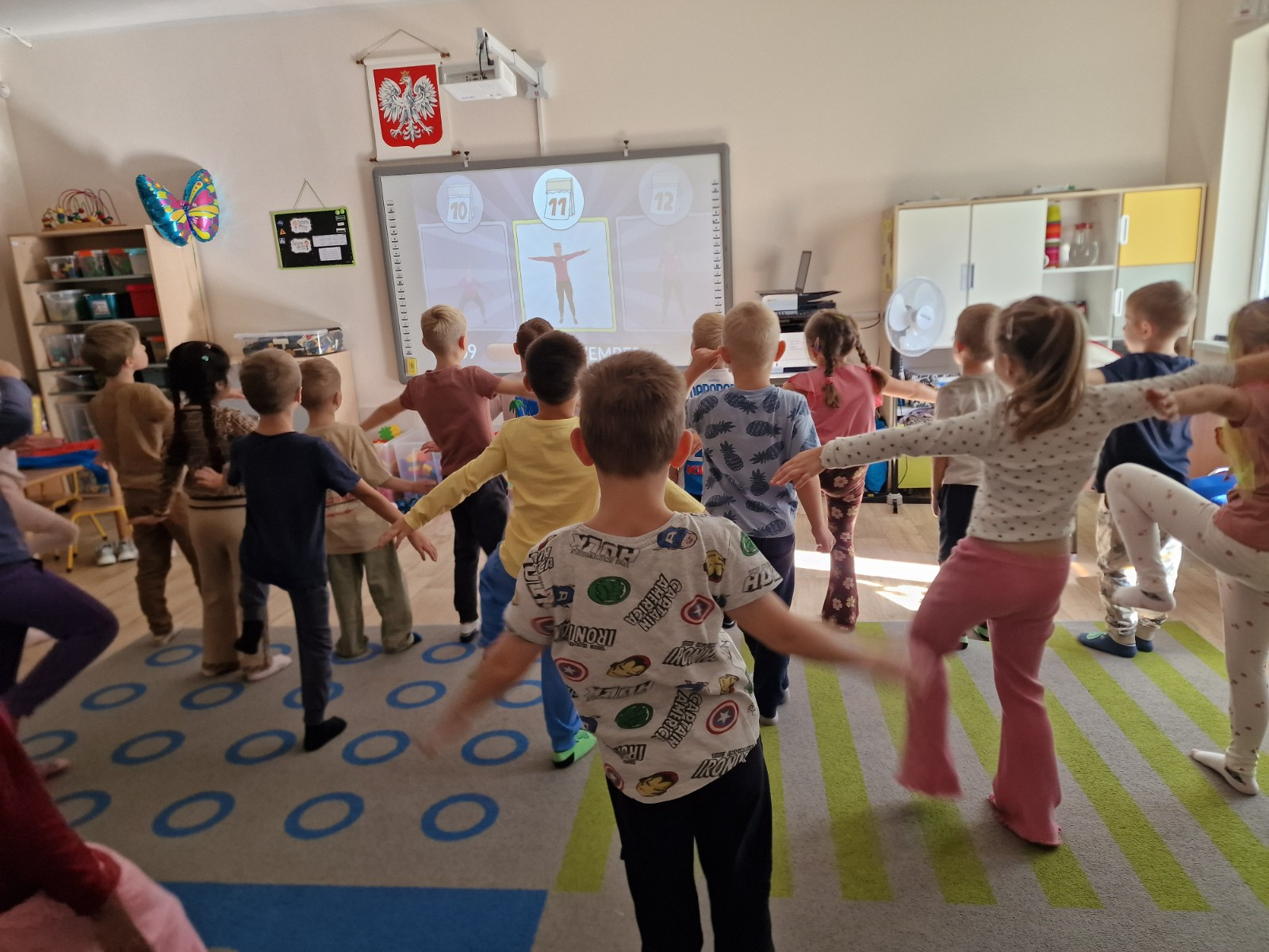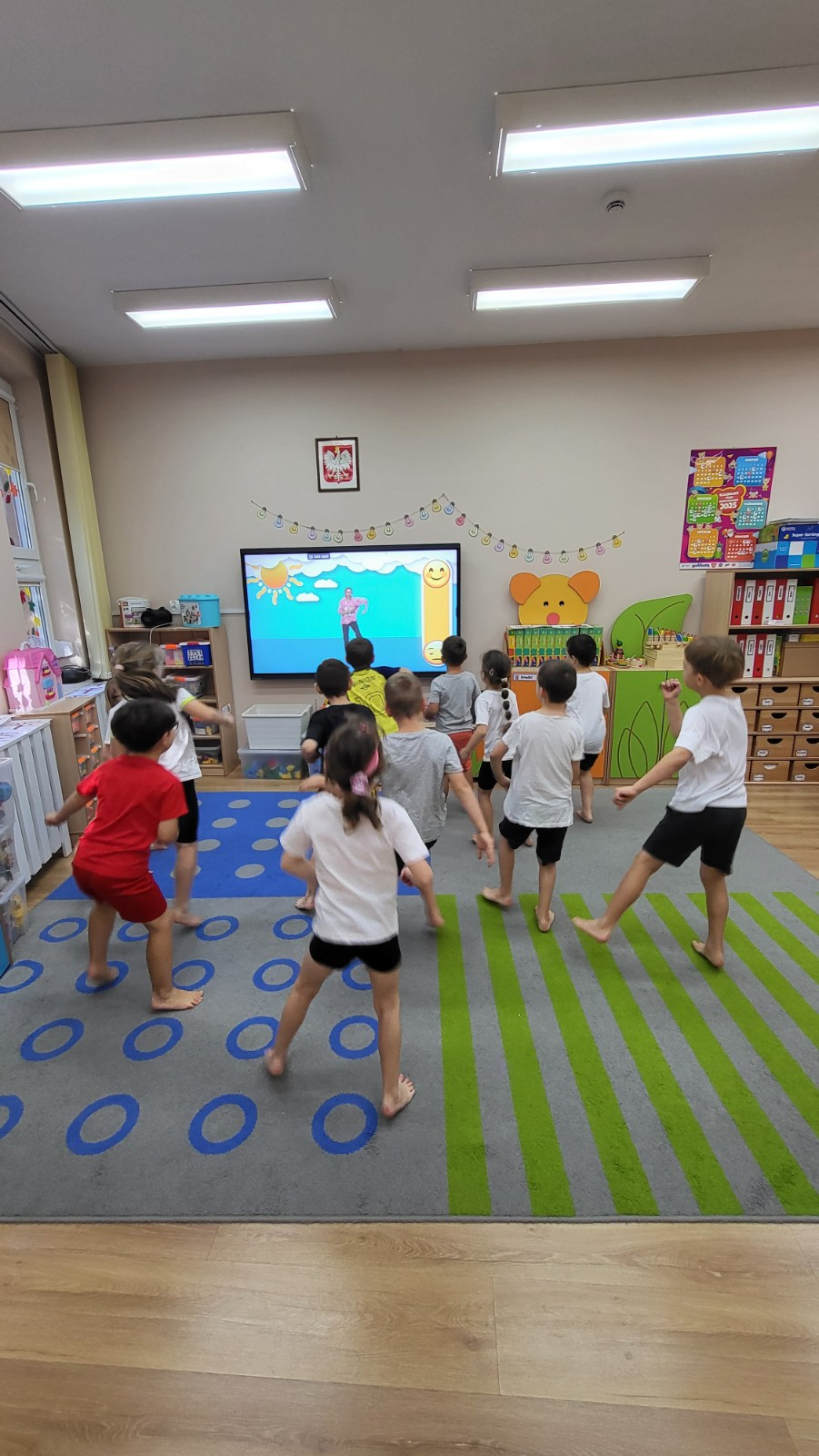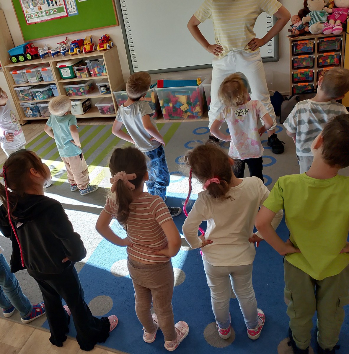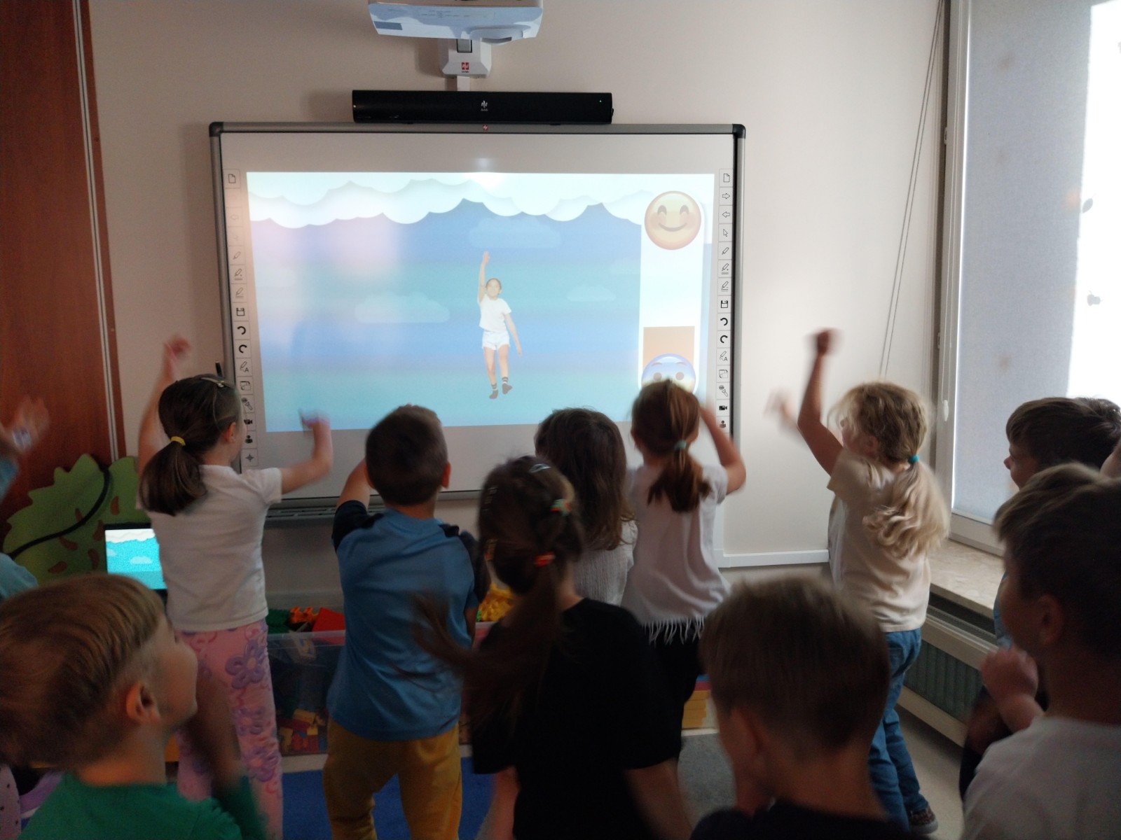Każda zabawa była okazją nie tylko do ćwiczeń, ale i do nauki- poprzez ruch utrwaliliśmy znajomość kolorów, rozwijaliśmy orientacje przestrzenną, trenowaliśmy dodawanie i ćwiczyliśmy umiejętności naśladowcze. Podczas wspólnych ćwiczeń uczyliśmy się obserwować emocje innych, rozpoznawać je i nazywać oraz dowiedzieliśmy się jak można wpływać na emocje innych i w prosty sposób poprawiać nastrój.