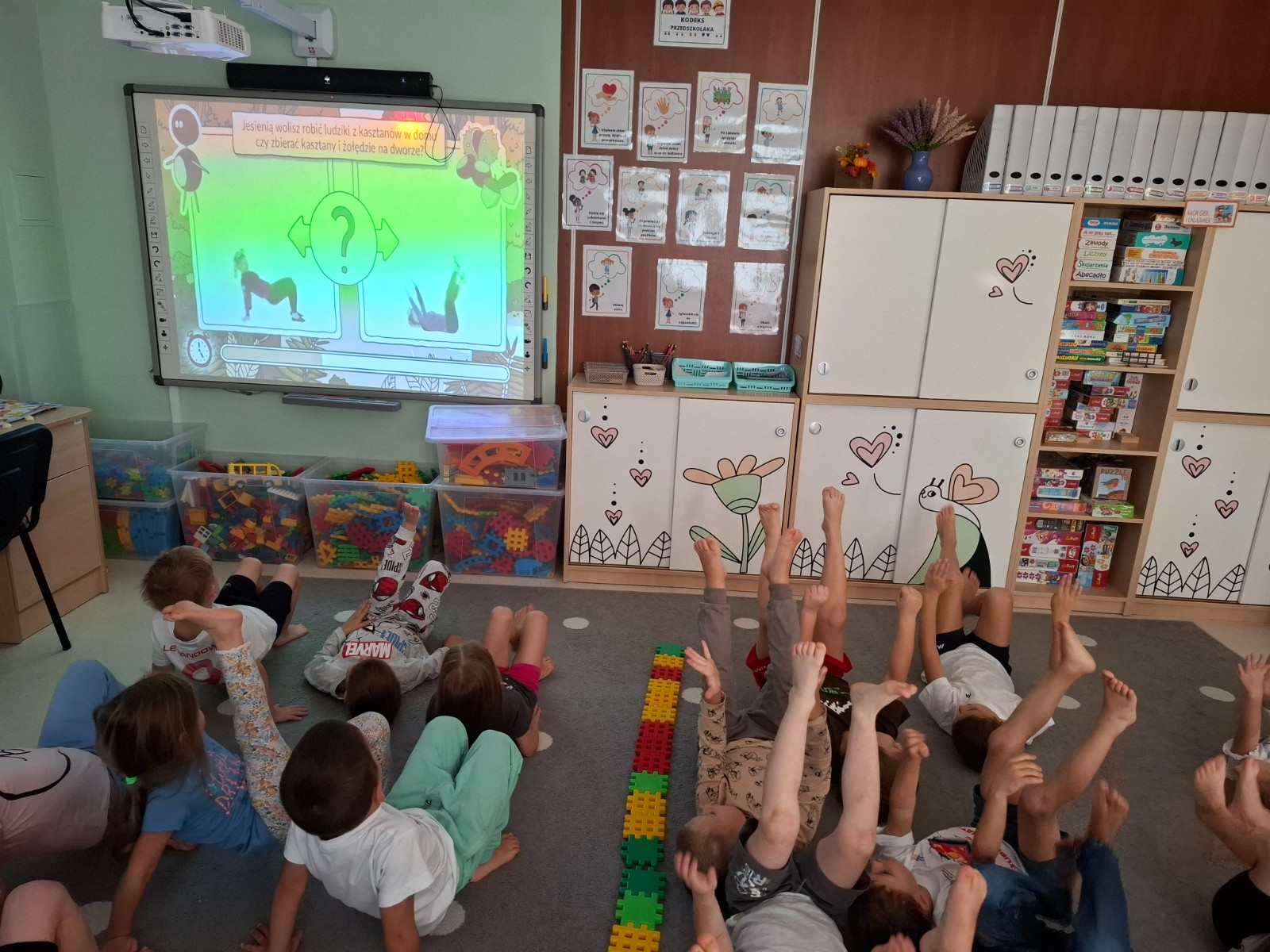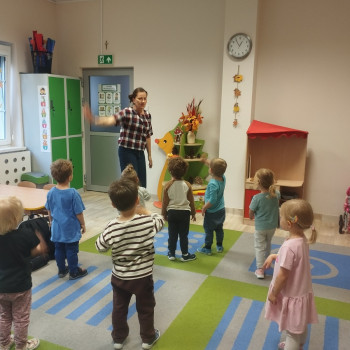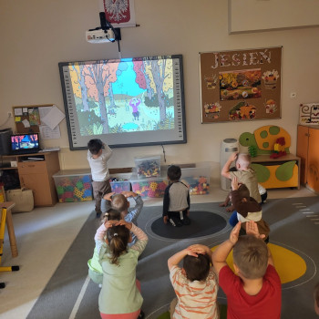 Ponad to przedszkolaki uczestniczyły w aktywnościach z języka angielskiego w trakcie, których dzieci rozpoznawały angielskie słówka związane z jesienią i wybierały odpowiednie obrazki, pokazując odpowiedzi ruchem.