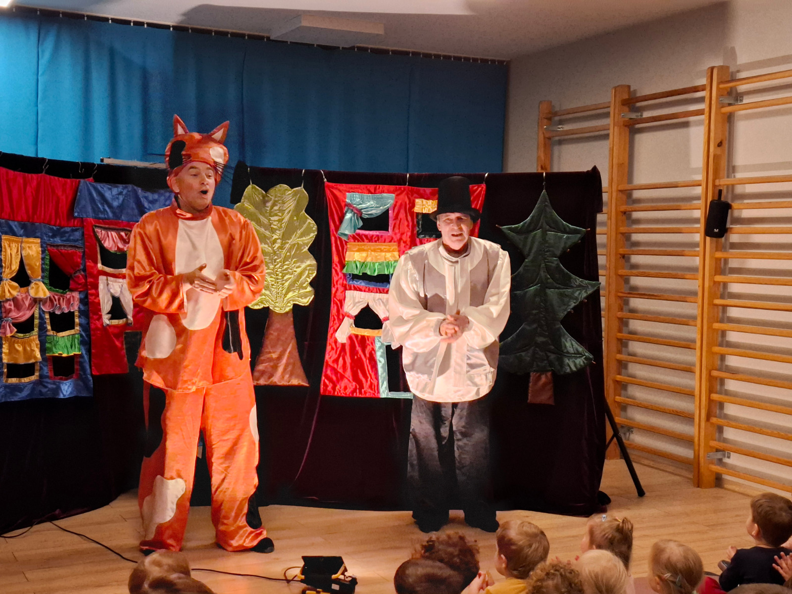 W tym tygodniu nasze przedszkolaki miały wyjątkową okazję uczestniczyć w przedstawieniu pt. „Kalosze szczęścia”, które było piękną i pełną humoru adaptacją baśni Hansa Christiana Andersena. Dzieci z ogromnym zainteresowaniem śledziły losy bohaterów, którzy dzięki zaczarowanym kaloszom mogli spełniać swoje najskrytsze marzenia. Przedstawienie nie tylko dostarczyło dzieciom wielu emocji i uśmiechu, lecz także przekazało ważne przesłanie – że prawdziwe szczęście często znajduje się bliżej, niż nam się wydaje.