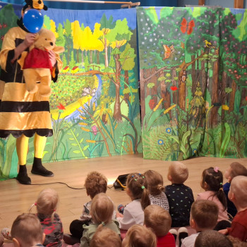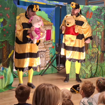 Nasze przedszkolaki miały wyjątkową okazję uczestniczyć w teatrzyku „Puchatkowe opowieści Misia”. Na scenie pojawił się sam Kubuś Puchatek, który z ogromnym entuzjazmem opowiadał o swoim ulubionym przysmaku – miodzie! Podczas przedstawienia dzieci nie tylko świetnie się bawiły, ale także dowiedziały się, skąd bierze się miód i jak wiele pracy muszą włożyć pracowite pszczółki, by powstał ten pyszny, złocisty skarb natury. Było mnóstwo śmiechu, radości i wspólnego śpiewania! Serdecznie dziękujemy aktorom z Warszawskiego Teatru dla Dzieci "Koliberek".